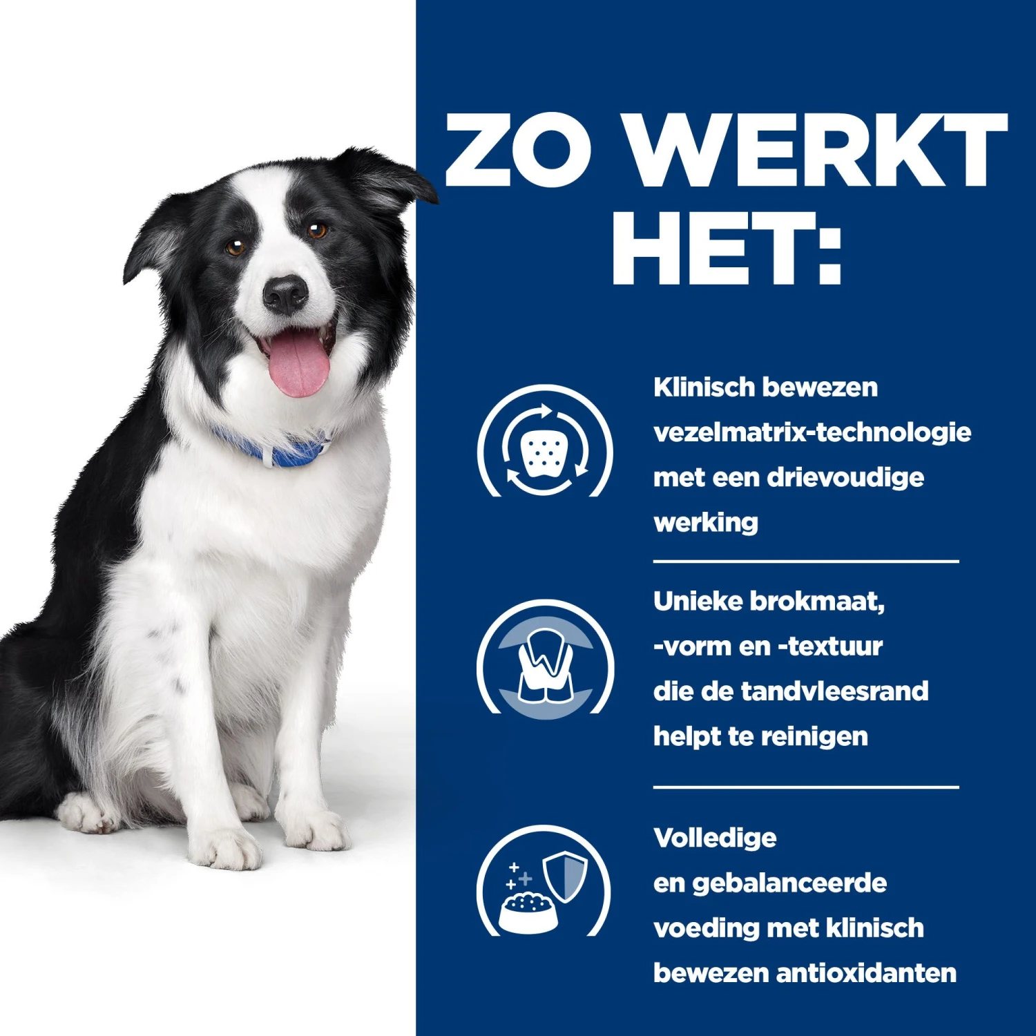 Hill’s t/d Canine zorgt voor sterke tanden en kiezen en gaat een slechte adem tegen. De brokken bevatten geen minerale schuurmiddelen of actieve chemicaliën.Het meest effectief zijn deze brokken als ze gegeven worden na een professionele gebitsbehandeling. Andere gebitsverzorgingsmethoden worden aanbevolen (bijvoorbeeld tandenpoetsen). De brokjes van Hill’s t/d zijn speciaal samengesteld en bevatten uitgelijnde vezels in een speciale vezelmatrix, waardoor het voedsel zich eerst rond de tanden zet voor het wordt gemaald. Dit heeft een licht schrapend effect, wat de ontwikkeling van tandsteen, tandplak en vlekken afremt. Matig verlaagde gehaltes aan eiwit, calcium, fosfor en natrium beperken de opbouw van tandplaque. Hill’s t/d Mini bevat kleinere brokjes voor honden die minder dan 10 kg wegen.