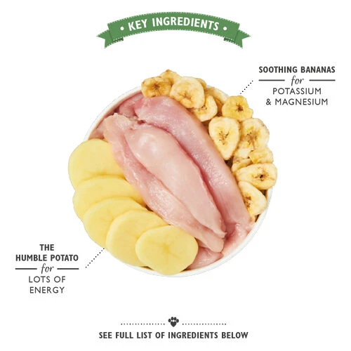 Recovery Recipe: Verse Kip (50%): Aardappelen (11%): Bananen (9%). Vitaminen & Mineralen, Prebiotica FOS & MOS.