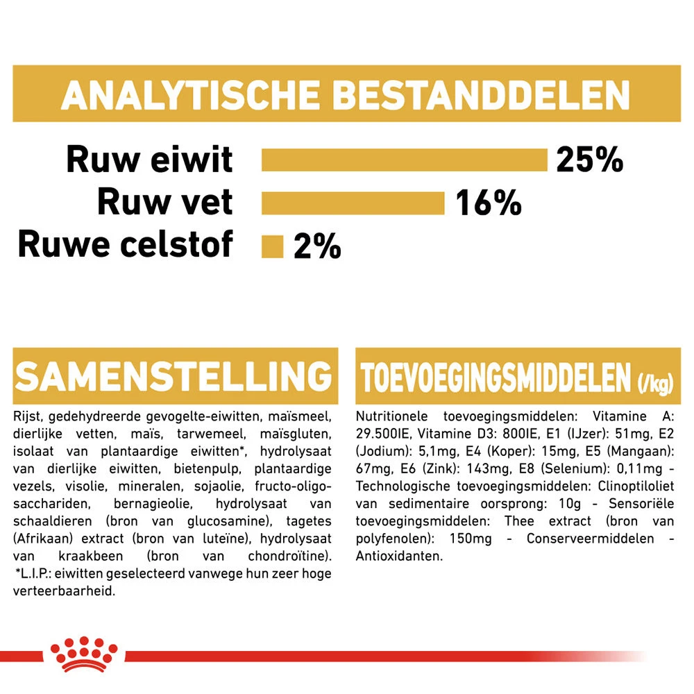 Rijst, gedehydreerde gevogelte-eiwitten, maïsmeel, dierlijke vetten, maïs, tarwemeel, maïsgluten, isolaat van plantaardige eiwitten, hydrolysaat van dierlijke eiwitten, bietenpulp, mineralen, plantaardige vezels, visolie, sojaolie, Fructo-Oligo-Sacchariden, bernagieolie, extracten uit groene thee en druiven (bron van polyfenolen), hydrolysaat van schaaldieren (bron van glucosamine), tagetes (Afrikaan) extract (bron van luteïne), hydrolysaat van kraakbeen (bron van chondroïtine).