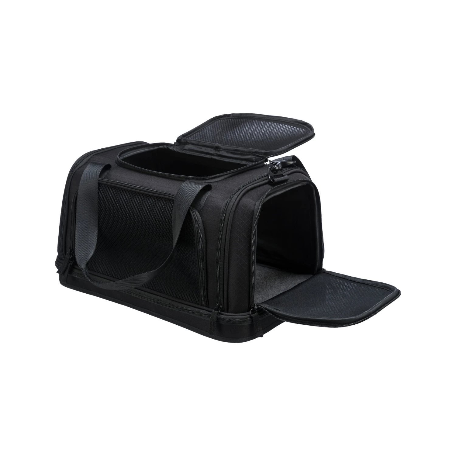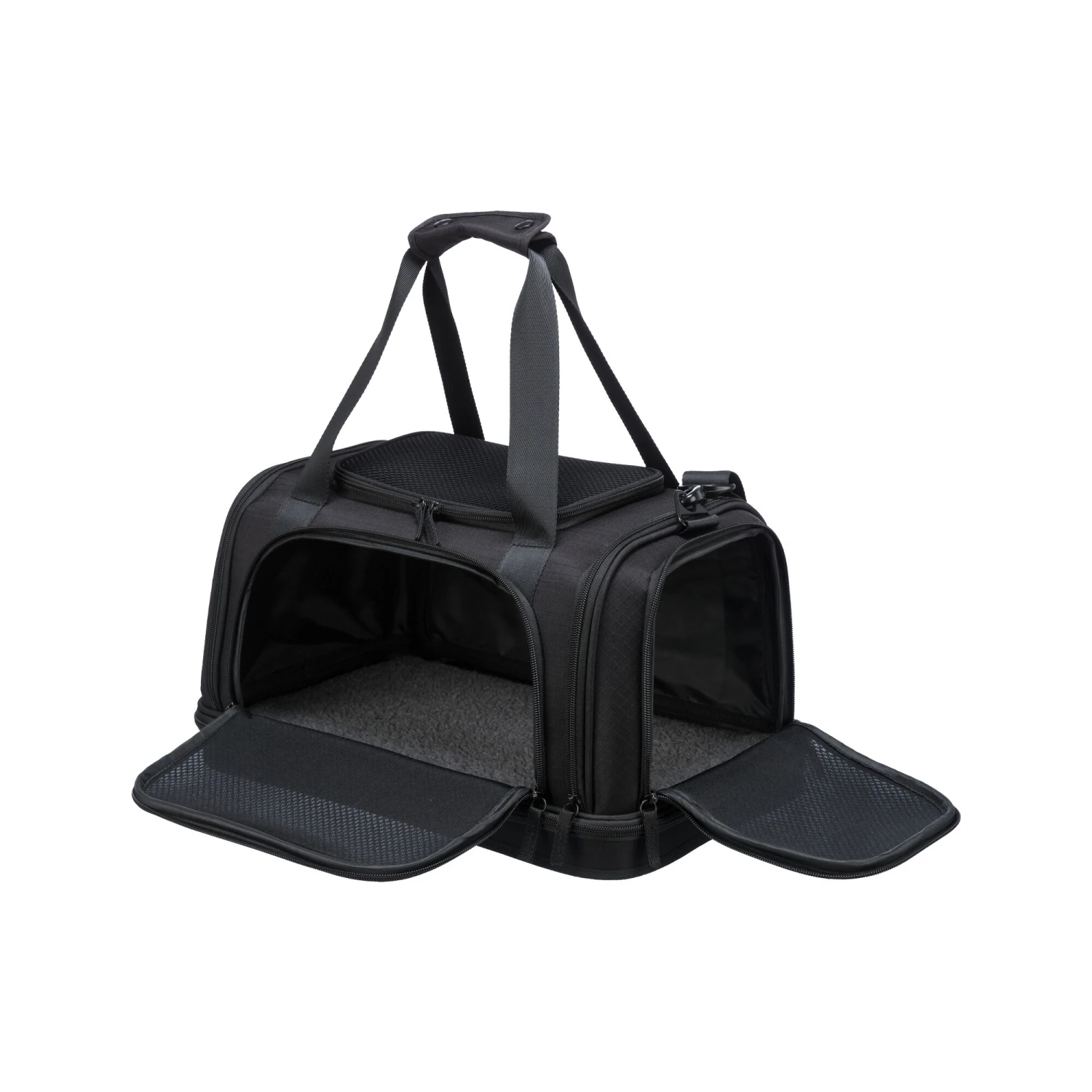 Wilt u uw (kleine) hond ook meenemen als handbagage in het vliegtuig? Met de Airline Tas Plane van Trixie kunt u met uw hond op een handige en veilige manier op reis met het vliegtuig. De tas heeft een formaat wat hem geschikt maakt om als handbagage gebruikt te worden. Deze tas is heel handig; u kunt hem namelijk bevestigen aan de trolley zodat u hem gemakkelijk mee kunt nemen. De tas is aan de zij-, voor- en bovenkant te openen. Hij heeft een buitenvak om spulletjes in op te bergen en twee handgrepen om de tas te dragen. De schouderriem is afneembaar en beschikt over een geïntegreerde korthouder. De bodemplaat is gevoerd en waterdicht voor extra stevigheid.